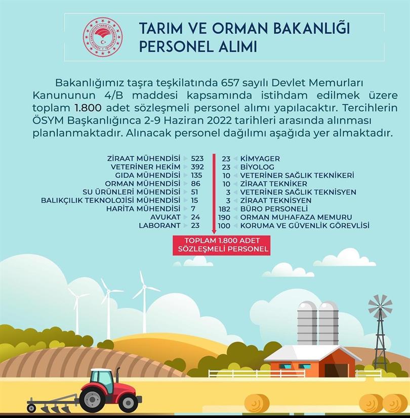 Bakanlığımız taşra teşkilatında 657 sayılı Devlet Memurları Kanununun 4/B maddesi kapsamında istihdam edilmek üzere 1800 sözleşmeli personel alımı yapılacaktır.