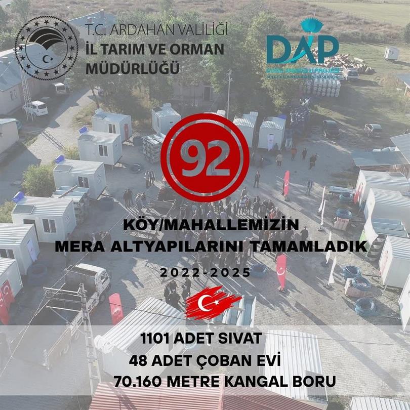 Bakanlığımız Bitkisel Üretim Genel Müdürlüğü, İl Müdürlüğümüz ile DAP Bölge Kalkınma İdaresi Başkanlığı iş birliğinde yürütülen Mera Islah ve Amenajman Projesi kapsamında, 2022–2025 yılları arasında 92 köyümüzde üreticilerimizin hizmetine çok sayıda yatırım kazandırılmıştır.