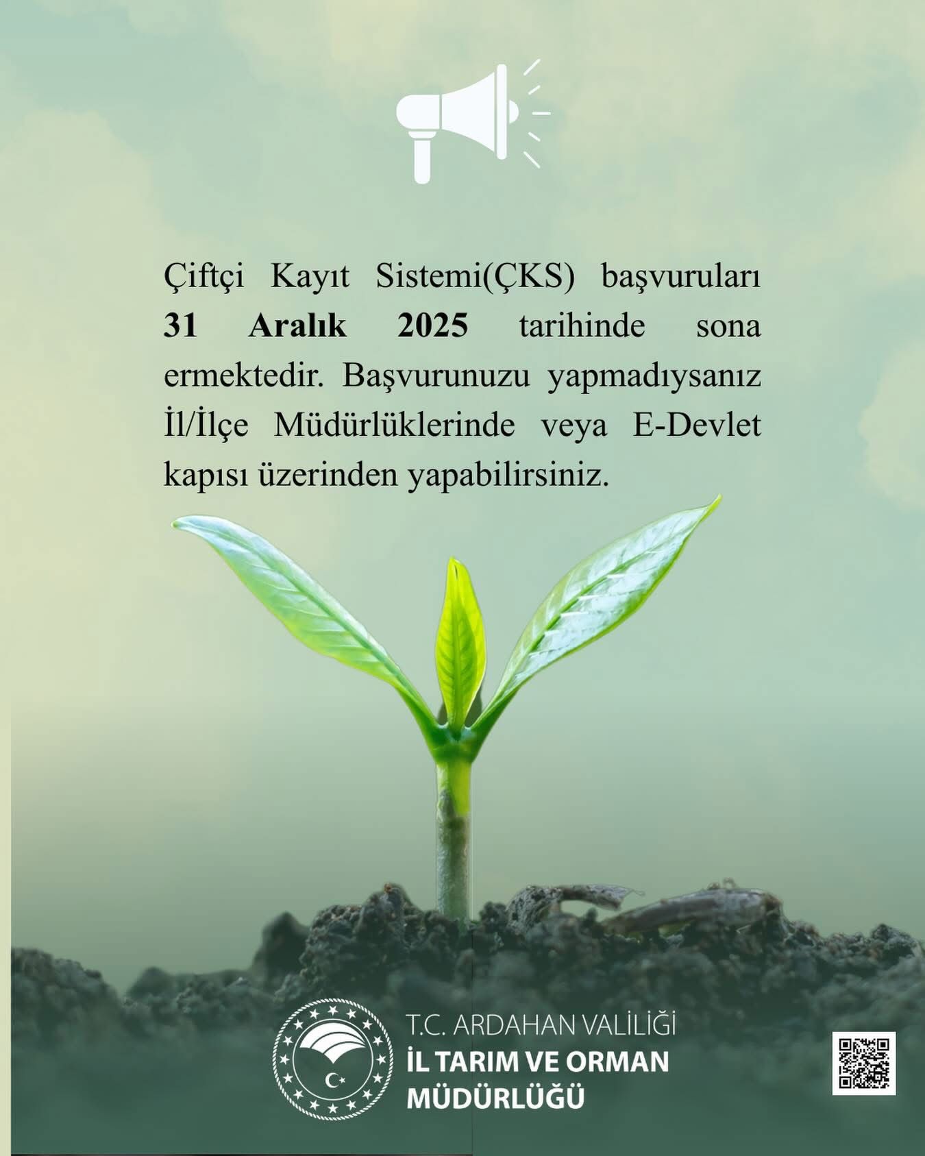 Çiftçi Kayıt Sistemi (ÇKS) başvuruları 31 Aralık 2025 tarihinde sona ermektedir. Başvurunuzu yapmadıysanız il/ilçe müdürlüklerinde veya e-Devlet kapısı üzerinden yapabilirsiniz.