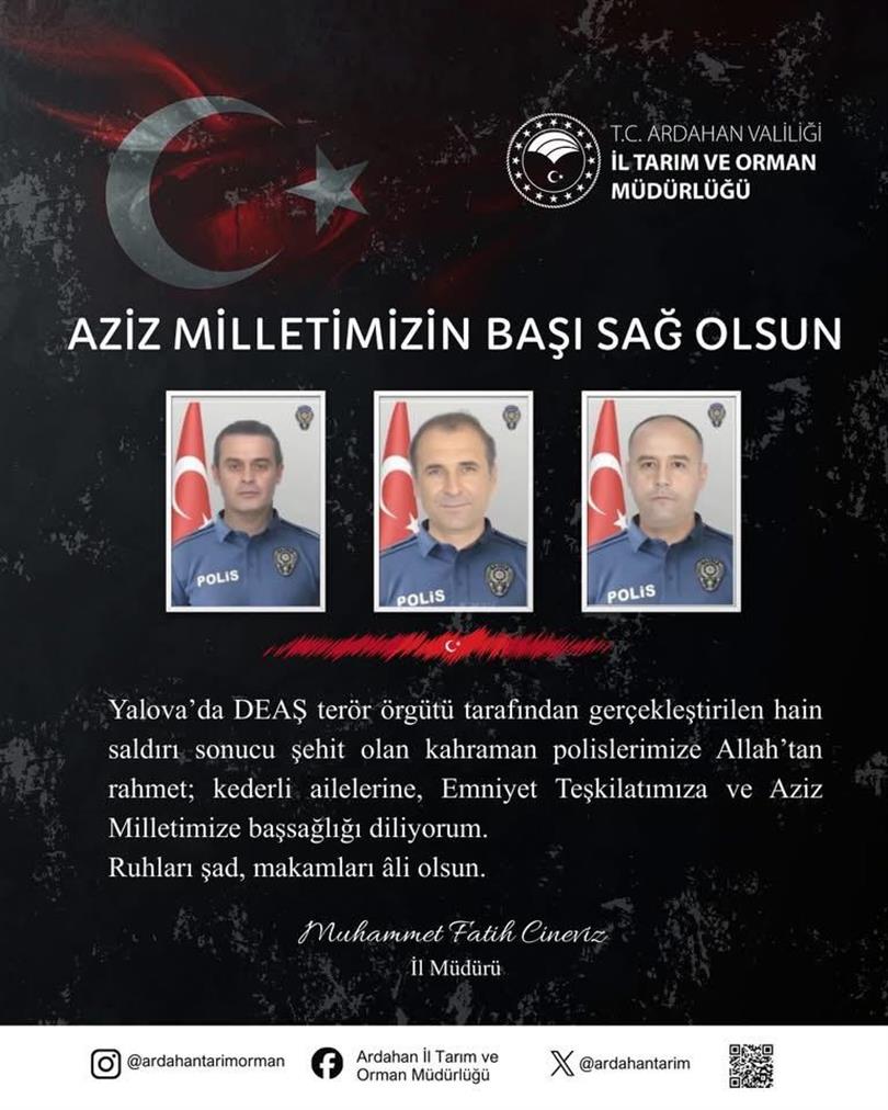 Yalova’da DEAŞ terör örgütü tarafından gerçekleştirilen hain saldırı sonucu şehit olan kahraman polislerimize Allah’tan rahmet; kederli ailelerine, Emniyet Teşkilatımıza ve Aziz Milletimize başsağlığı diliyorum. Ruhları şad, makamları âli olsun.