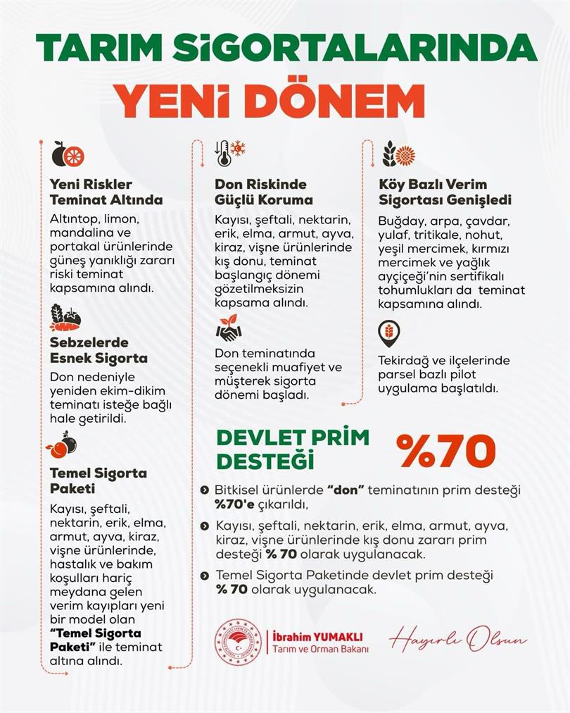Meyve ve sebzelerde don riskine karşı kapsamı genişletiyoruz. Hububat ve bakliyatta Köy Bazlı Verim Sigortasını sertifikalı tohumlukları da kapsayacak şekilde güçlendiriyoruz. Parsel bazlı pilot uygulamayı Tekirdağ’da başlatıyoruz. Don teminatı ve Temel Sigorta Paketi için devlet prim desteğini %70’e çıkarıyoruz. Üreticimizin emeğini daha geniş kapsamla, daha güçlü desteklerle korumaya devam ediyoruz.Hayırlı olsun.