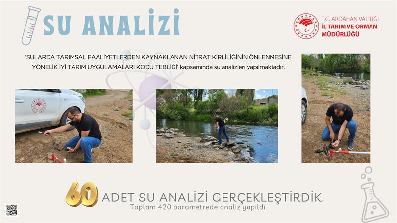 ‘SULARDA TARIMSAL FAALİYETLERDEN KAYNAKLANAN NİTRAT KİRLİLİĞİNİN ÖNLENMESİNE YÖNELİK İYİ TARIM UYGULAMALARI KODU TEBLİĞİ’ kapsamında su analizleri yapılmaktadır.60 ADET SU ANALİZİ GERÇEKLEŞTİRDİK.Toplam 420 parametrede analiz yapıldı.