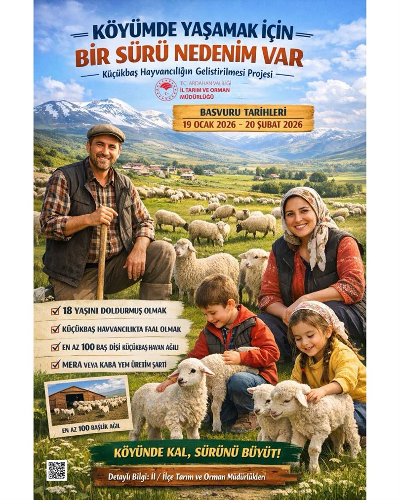 Köyümde Yaşamak İçin Bir Sürü Nedenim Var” Projesi ileküçükbaş hayvancılık yapan üreticilerimize güç veriyoruz. Aile emeğiyle, kuzuların neşesiyle, meranın bereketiyle… Başvuru Tarihleri:19 Ocak 2026 – 20 Şubat 2026 Faal küçükbaş hayvancılık yapan üreticiler Köyünde üretmeye devam etmek isteyenler Sürüsünü büyütmek isteyenler için önemli bir fırsat! Detaylı bilgi ve başvuru için:https://ardahan.tarimorman.gov.tr/.../Koyumde-Yasamak... İl / İlçe Tarım ve Orman Müdürlüklerine başvurabilirsinizKöyünde kal Üret, Sürünle güçlen!