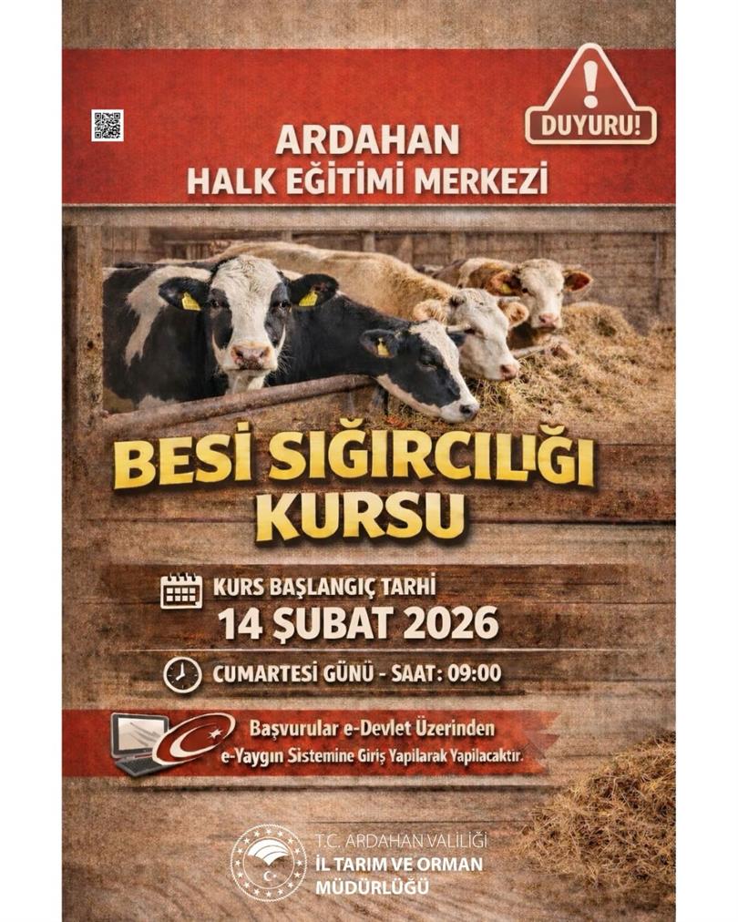 İl Müdürlüğümüz ile İl Millî Eğitim Müdürlüğü Ardahan Halk Eğitimi Merkezi Müdürlüğü iş birliğindeBesi Sığırcılığı Kursu açılacaktır. Kurs Başlangıç Tarihi: 14 Şubat 2026 Gün / Saat: Cumartesi – 09.00 Yer: Ardahan Halk Eğitimi Merkezi Başvurular, e-Devlet üzerinden e-Yaygın sistemine giriş yapılarak gerçekleştirilecektir.Hayvancılık alanında bilgi ve becerilerini geliştirmek isteyen tüm vatandaşlarımız davetlidir.